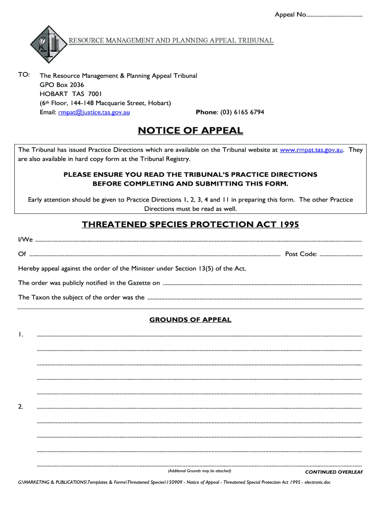 ... Notice of Appeal — Threatened Special Protection Act 1995 — electronic.doc ... Directions which are available on the Tribunal website at www.rmpat.tas.gov.au.
