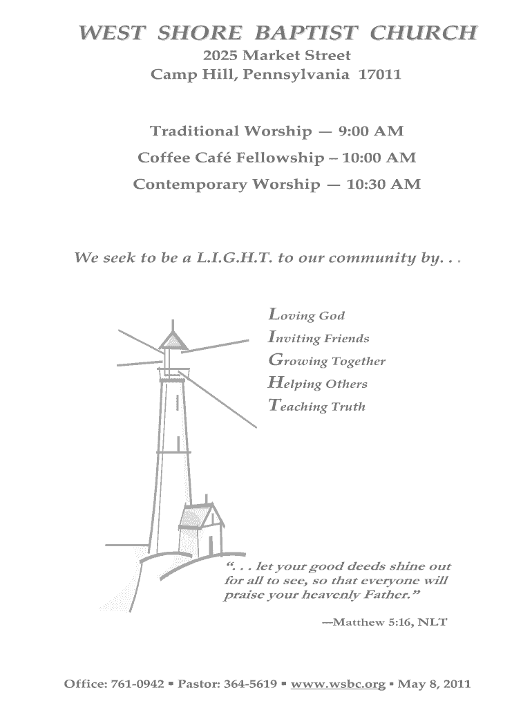 WEST SHORE BAPTIST CHURCH 2025 Market Street Camp Hill, Pennsylvania 17011 Traditional Worship 9:00 AM Coffee CAF Fellowship 10:00 AM Contemporary Worship 10:30 AM We seek to be an L.I.G.H.T. to our