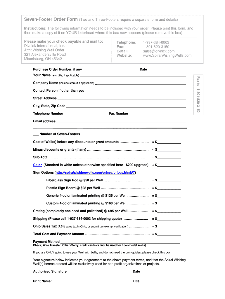 This form is used to order Seven-Footer Spiral Wishing Wells from Divnick International, Inc. It includes instructions for filling out the order, payment details, and options for customization.