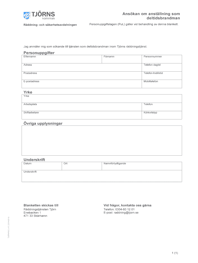 Get the free Anskan om anstllning som deltidsbrandman - tjornse