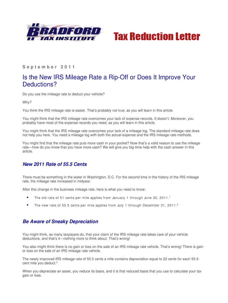 New IRS Mileage Rate Increased to 55.5 Cents per Mileage 1 of 4ShareSeptember 2011Is the New IRS Mileage Rate a Ripoff or Does It Improve Your