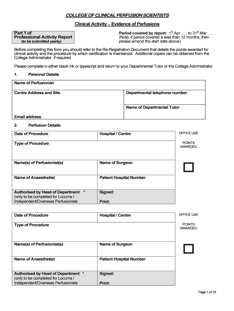 COLLEGE OF CLINICAL PERFUSION SCIENTISTS Clinical Activity Evidence of Perfusion Period covered by report: 1st Apr. To 31st Mar. (Note: if period covered is less than 12 months, then please amend