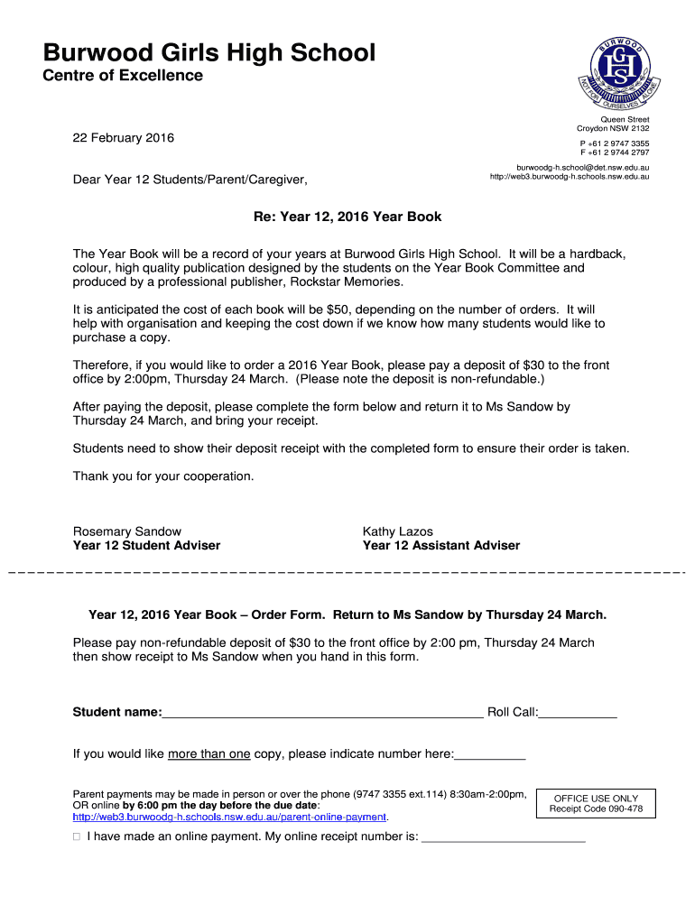 Get the free Yr.12 Year Book ordering and deposit letter 22 Feb 2016 - web3 burwoodg-h schools ns...