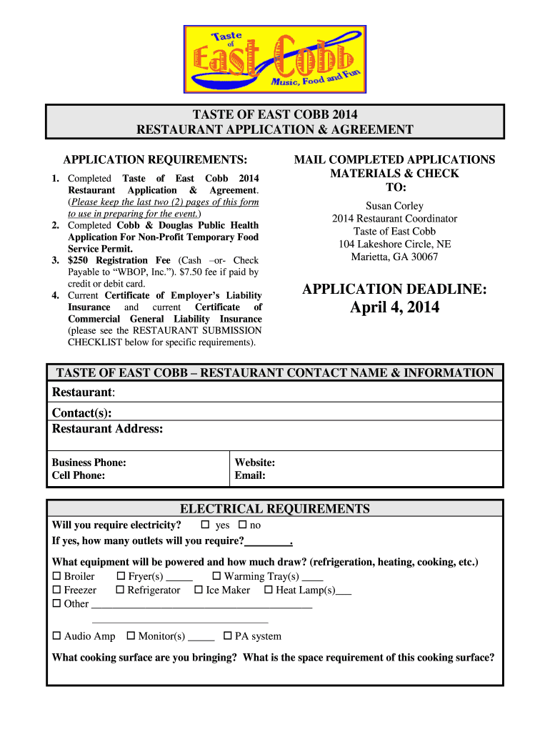 TASTE OF EAST COBB 2014 RESTAURANT APPLICATION & AGREEMENT APPLICATION REQUIREMENTS: MAIL COMPLETED APPLICATIONS MATERIALS & CHECK TO: 1. Completed Taste of East Cobb 2014 Restaurant Application &