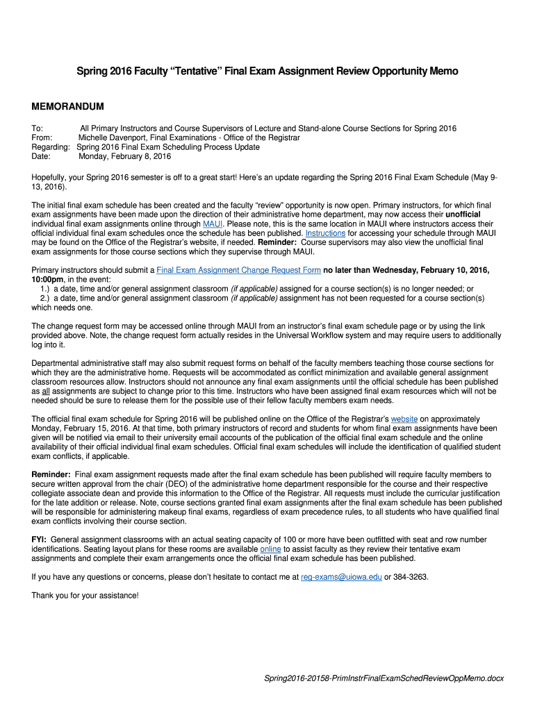 Spring 2016 Faculty Tentative Final Exam Assignment Review Opportunity Memo MEMORANDUM To: All Primary Instructors and Course Supervisors of Lecture and Standalone Course Sections for Spring 2016