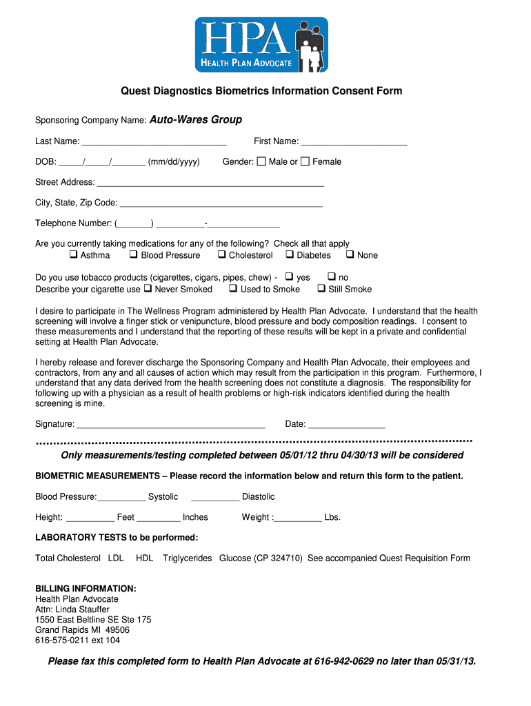 Quest Diagnostics Biometrics Information Consent Form Sponsoring Company Name: Automates Group Last Name: DOB: / / (mm×dd/YYY) First Name: Gender: Male or Female Street Address: City, State, Zip