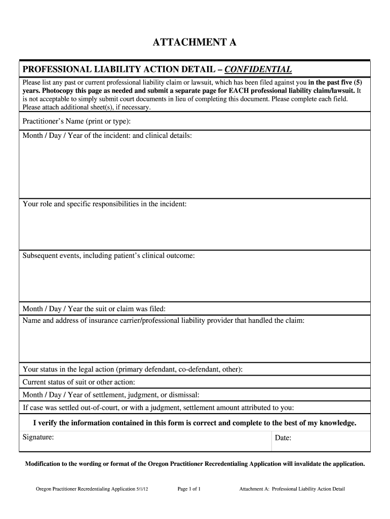 The Oregon Practitioner Recredentialing Application is a professional liability action detail form used by healthcare practitioners in Oregon to report past or current claims or lawsuits.