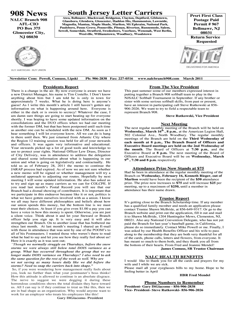 This document serves as a newsletter for NALC Branch 908, providing updates on union activities, meetings, and announcements relevant to its members.