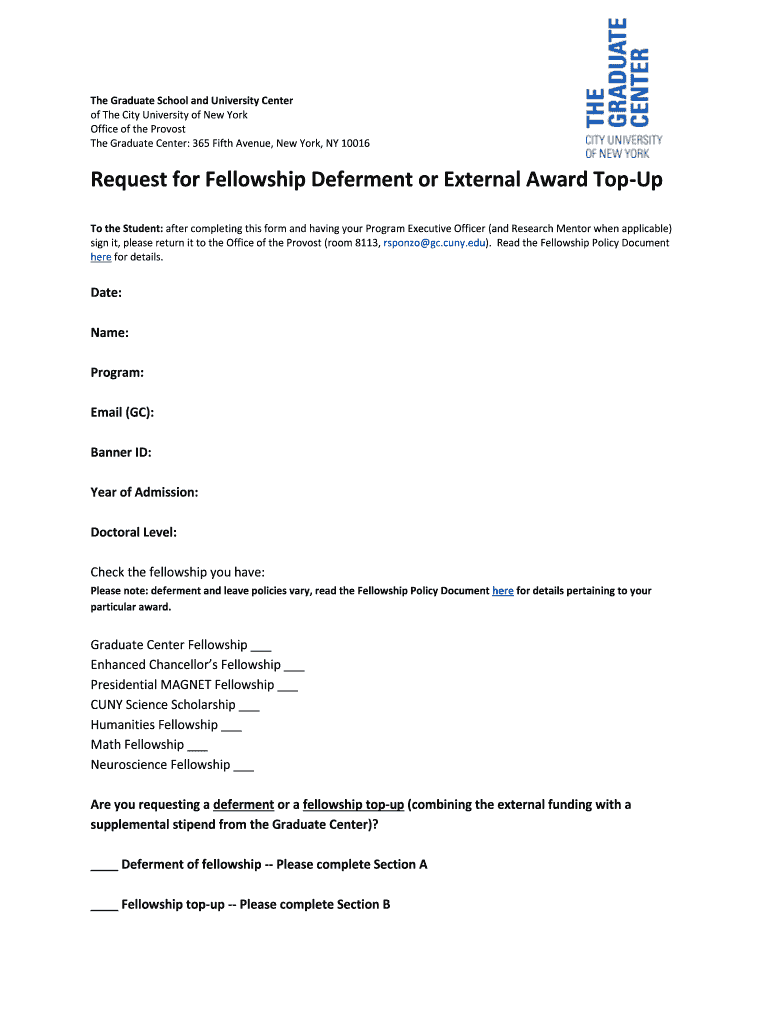 Get the free BRequestb for Fellowship bDefermentb or External Award Top-Up - gc cuny