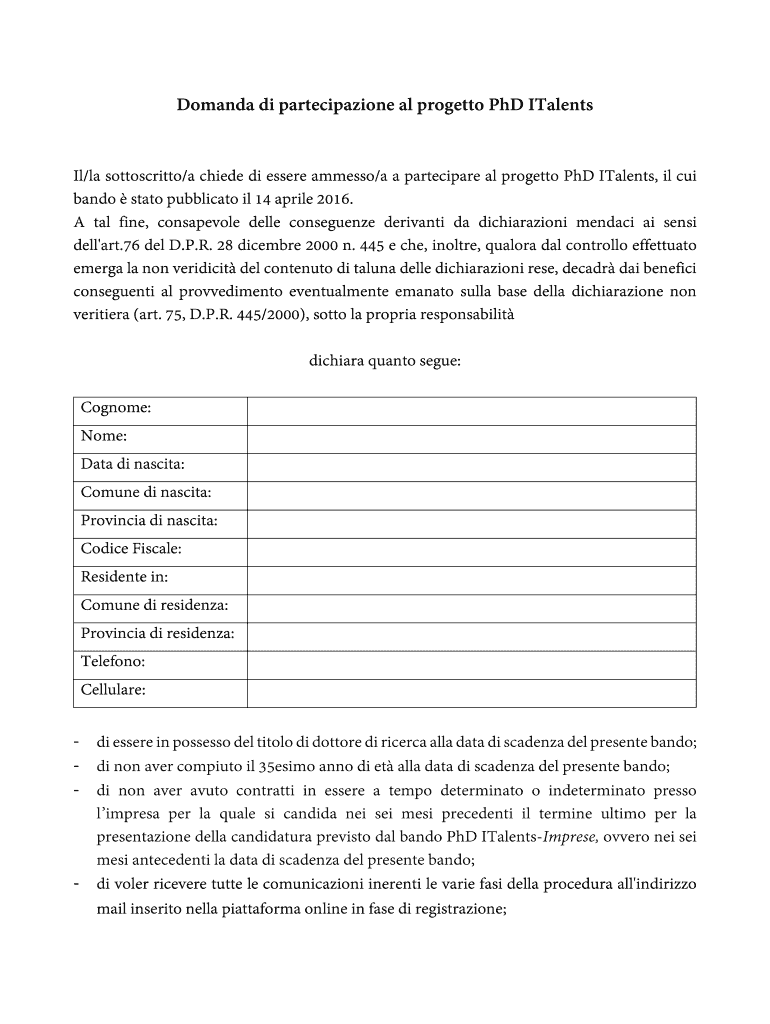 Ottieni il gratuito Domanda di partecipazione al progetto PhD ITalents - Crui