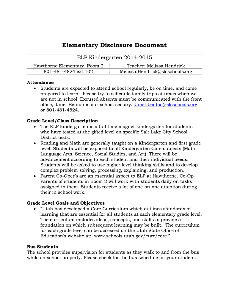 Elementary Disclosure Document ELP Kindergarten 20142015 Hawthorne Elementary, Room 2 8014814824 ext.102 Teacher: Melissa Hendrick Melissa. Hendrick schools.org Attendance Students are expected to