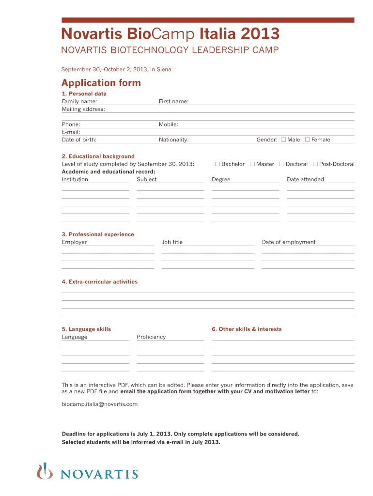 Novartis Became Italia 2013 September 30,October 2, 2013, in Saint Application form 1. Personal data Family name: Mailing address: First name: Phone: Email: Date of birth: Mobile: Nationality: 2.