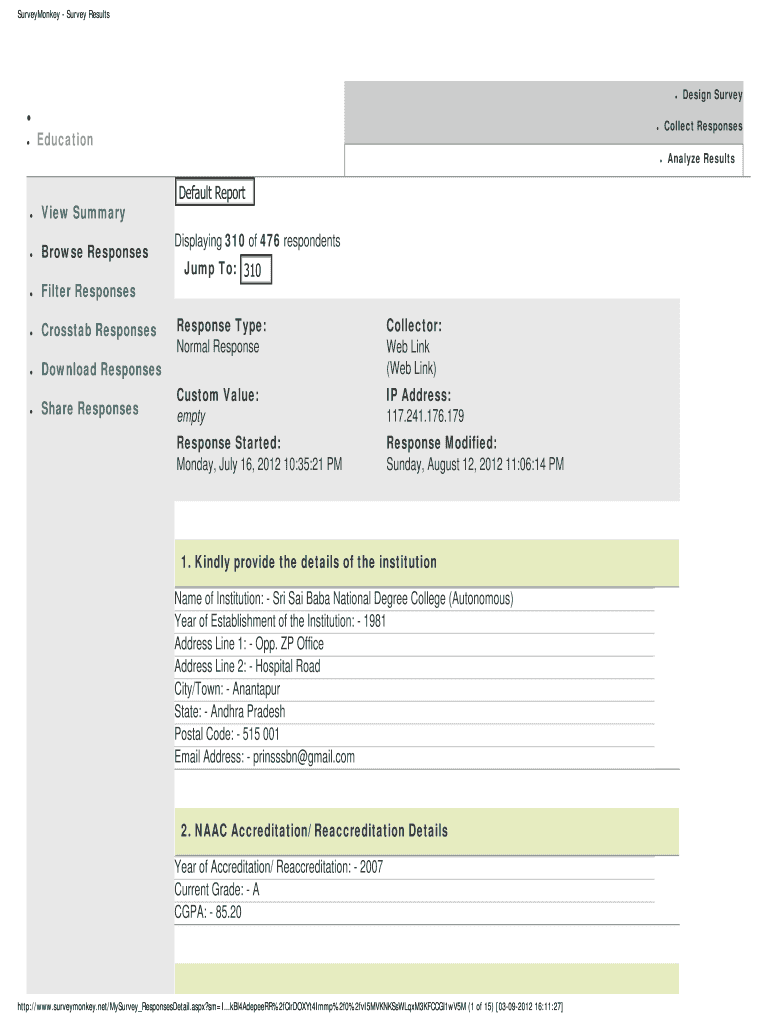 SurveyMonkey Survey Results Collect Responses Education View Summary Browse Responses Filter Responses Cross tab Responses Download Responses Share Responses Default Report Displaying 310 of 476 respondents