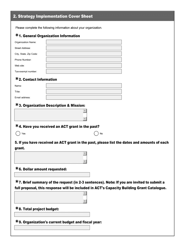 1.ACT 2013 Strategy Implementation Grant LOI Application ACTforAlexandria×ACT×ispleasedtoofferfundingopportunitiestononprofitorganizationsservingtheAlexandria communitytoaddressoperationalcapacityissueswithintheirorganizations.