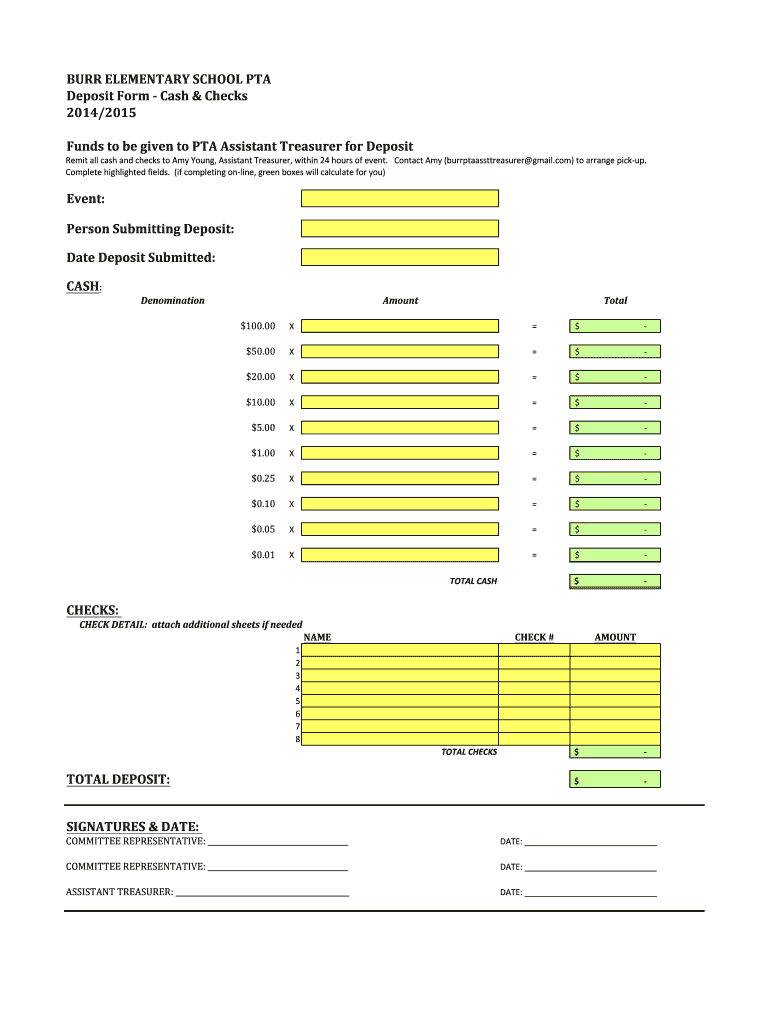 BURR ELEMENTARY SCHOOL PTA Deposit Form Cash & Checks 2014×2015 Funds to be given to PTA Assistant Treasurer for Deposit Remit all cash and checks to Amy Young, Assistant Treasurer, within 24 hours