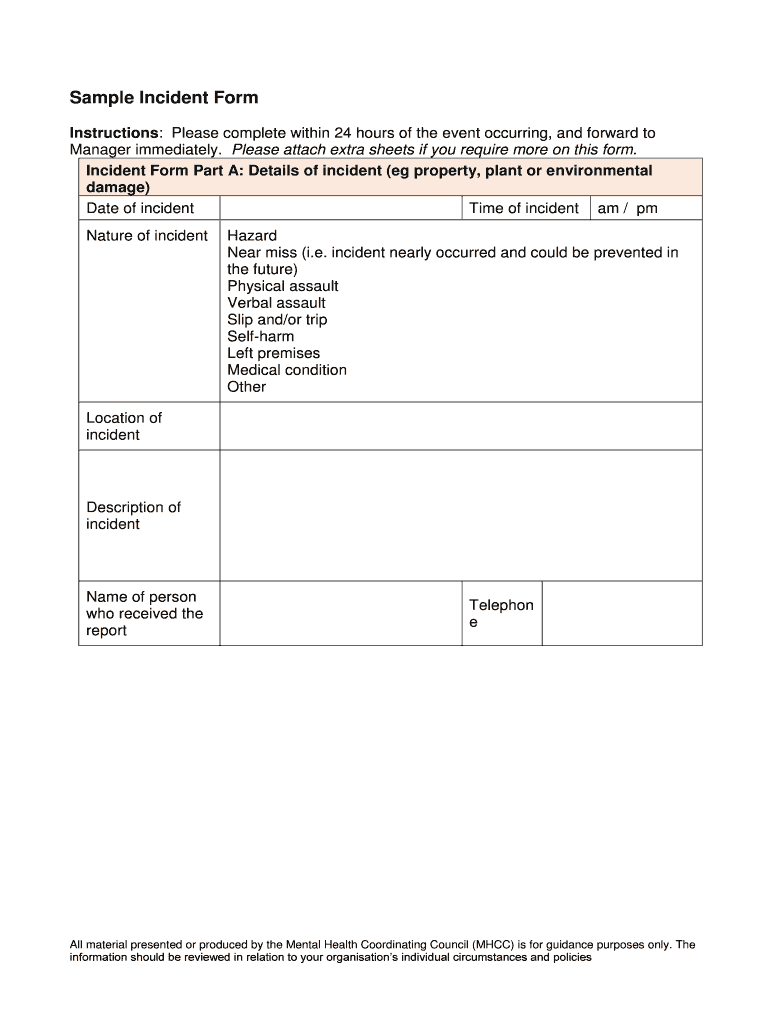 Sample Incident Form Instructions: Please complete within 24 hours of the event occurring, and forward to Manager immediately. Please attach extra sheets if you require more on this form. Incident