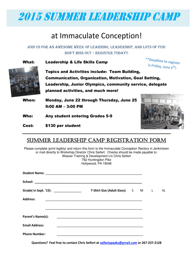 2015 Summer Leadership Camp at Immaculate Conception! Join us for an awesome week of learning, leadership, and lots of fun! Don't Miss out Register Today!! What: Leadership & Life Skills Camp Topics