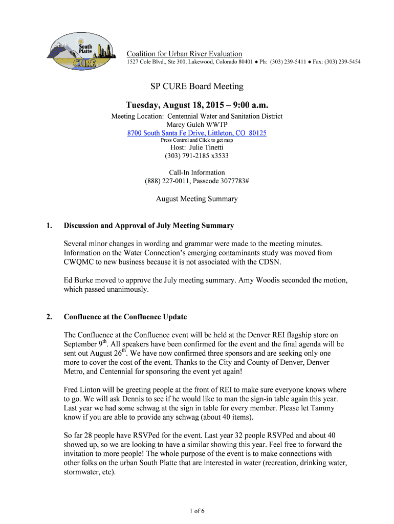 Coalition for Urban River Evaluation 1527 Cole Blvd., Ste 300, Lakewood, Colorado 80401 pH: (303× 2395411 Fax: (303× 2395454 SP CURE Board Meeting Tuesday, August 18, 2015 9:00 a.m. Meeting Location: