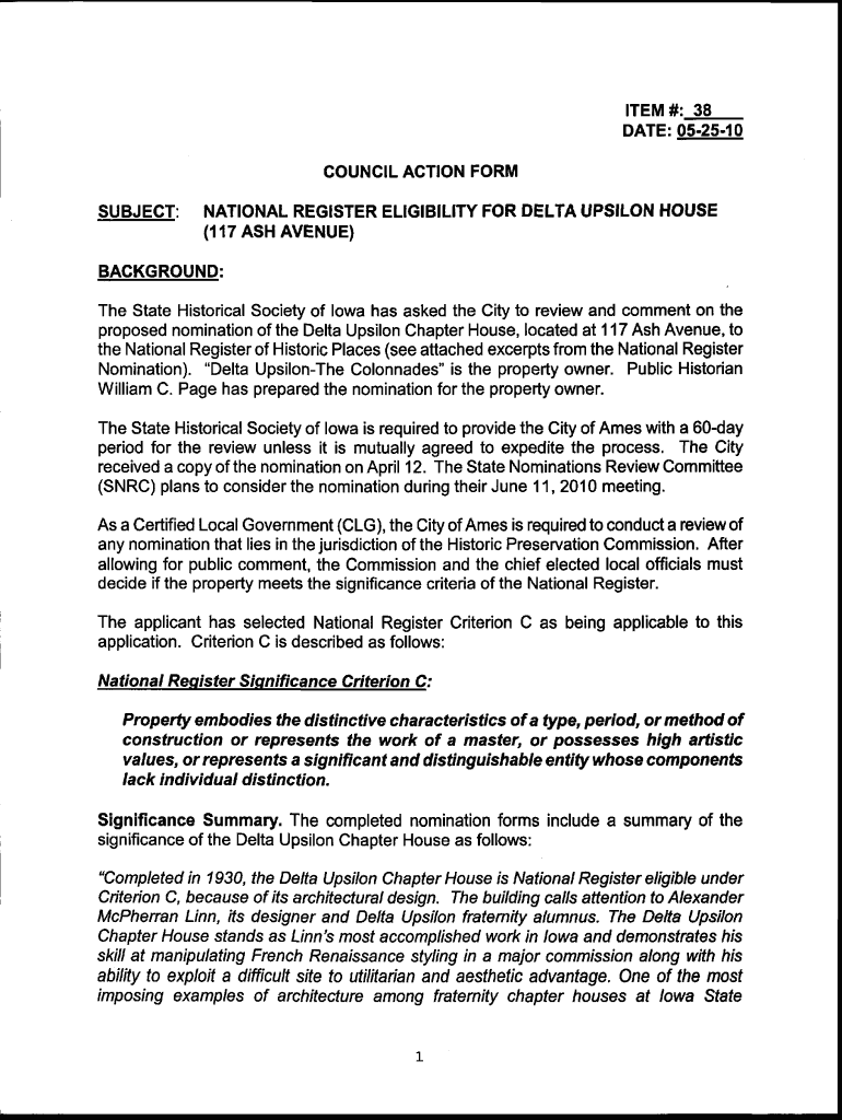 ITEM#:j!8 DATE:05-25-10 FORM COUNCIL ACTION HOUSE REGISTER FORDELTAUPSILON SUBJECT: NATIONAL ELIGIBILITY (117ASHAVENUE) BACKGROUND: on The StateHistorical Society Omahas asked the City to review and
