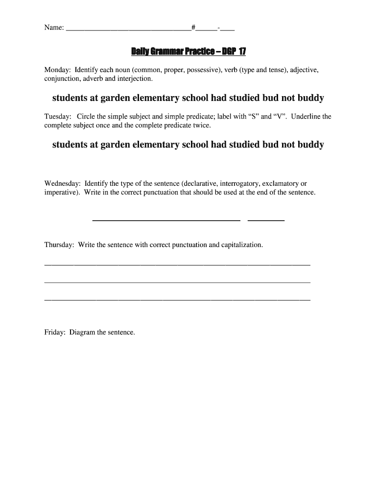 Name: # Daily Grammar Practice DGP 17 Monday: Identify each noun (common, proper, possessive×, verb (type and tense×, adjective, conjunction, adverb and interjection. Students at garden elementary