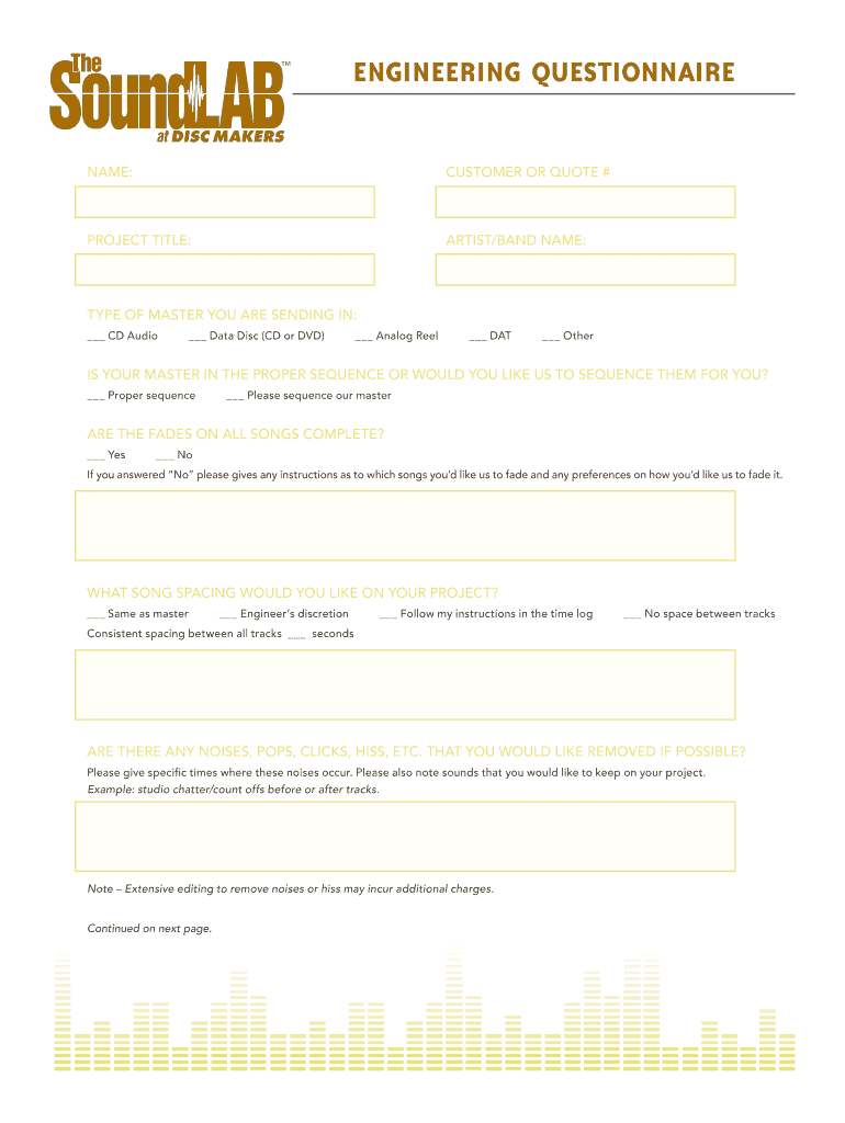 Engineering Questionnaire NAME: Customer or quote # project title: artist×band name: Type of master you are sending in: CD Audio Data Disc (CD or DVD) Analog Reel DAT Other Is your master in the