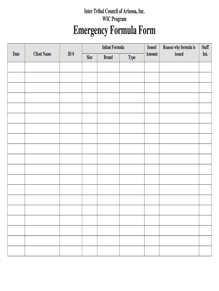 A form used by the Inter Tribal Council of Arizona, Inc. WIC Program to issue emergency infant formula, including details such as client information, formula specifics, and the reason for issuance.