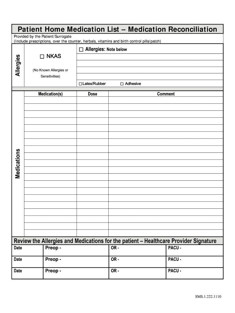 Patient Home Medication List Medication ReconciliationAllergiesProvided by the Patient×Surrogate (Include prescriptions, over the counter, herbals, vitamins and birth control pills×patch) NAS Allergies:
