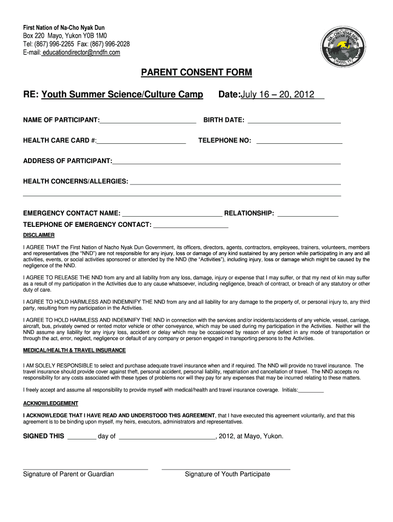 First Nation of Nacho Yak Dun Box 220 Mayo, Yukon Y0B 1M0 Tel: (867× 9962265 Fax: (867× 9962028 Email: education director nndfn.com PARENT CONSENT FORM RE: Youth Summer Science×Culture Camp NAME