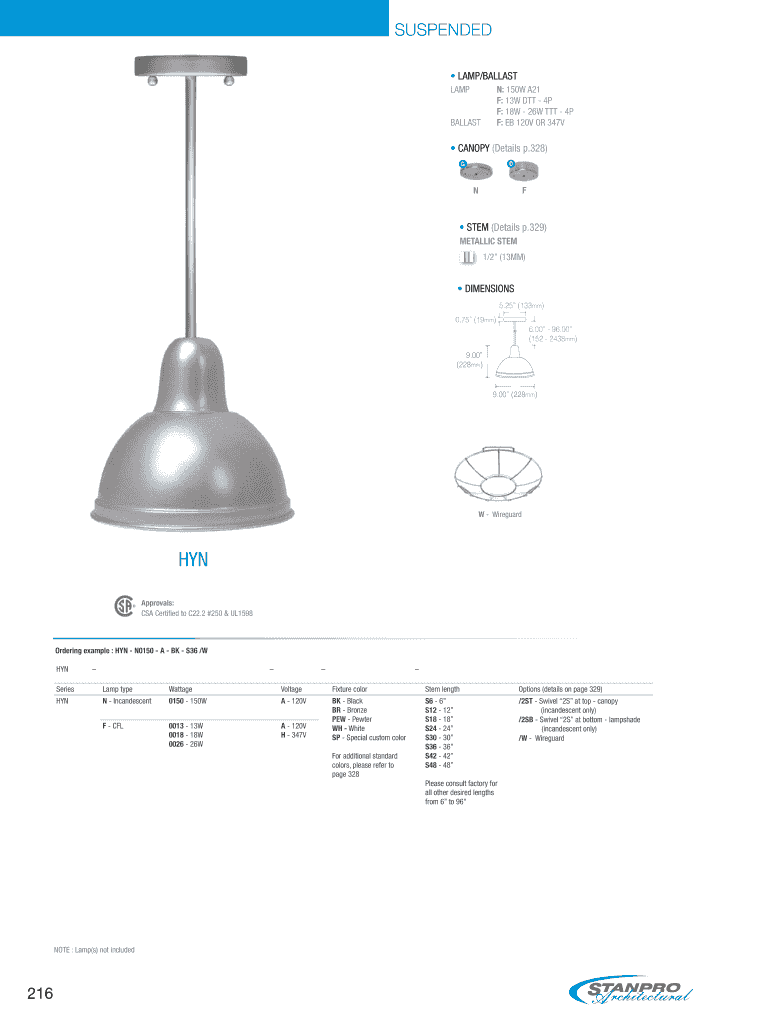 216 SUSPENDED Dimensions S U 0150 36 Lamp N: 150W a21 F: 13W DTT 4p F: 18W 26W TTT 4p Ballast F: EX 120v or 347v Canopy (Details p.328)
