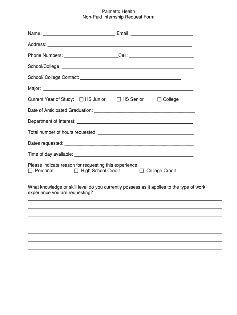 Palmetto Health Unpaid Internship Request Form Name: Email: Address: Phone Numbers: Cell: School×College: School/ College Contact: Major: Current Year of Study: HS Junior HS Senior College Date of
