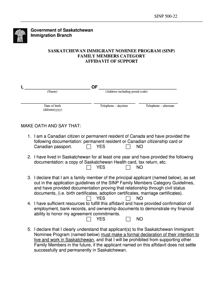 SING 50022 Government of Saskatchewan Immigration Branch SASKATCHEWAN IMMIGRANT NOMINEE PROGRAM (SING) FAMILY MEMBERS CATEGORY AFFIDAVIT OF SUPPORT I, OF (Name) (Address including postal code) Date