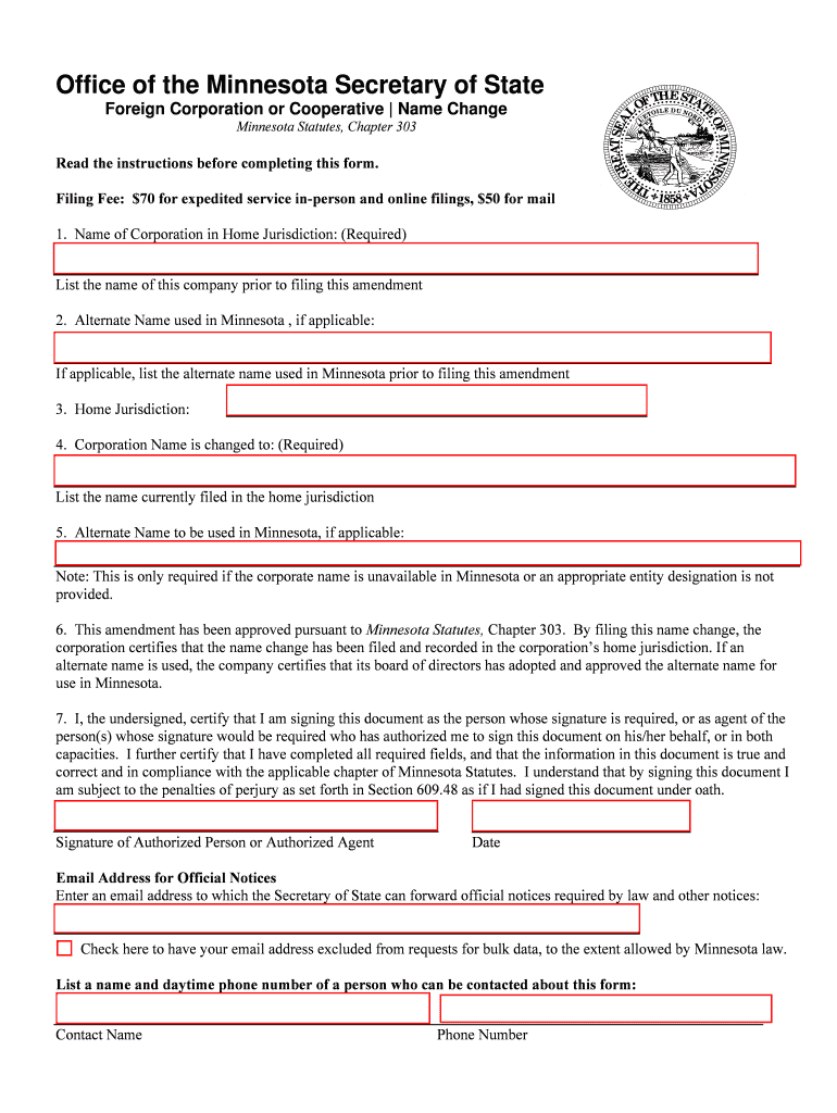 Office of the Minnesota Secretary of State Foreign Corporation or Cooperative Name Change Minnesota Statutes, Chapter 303 Read the instructions before completing this form. Filing Fee: $70 for expedited