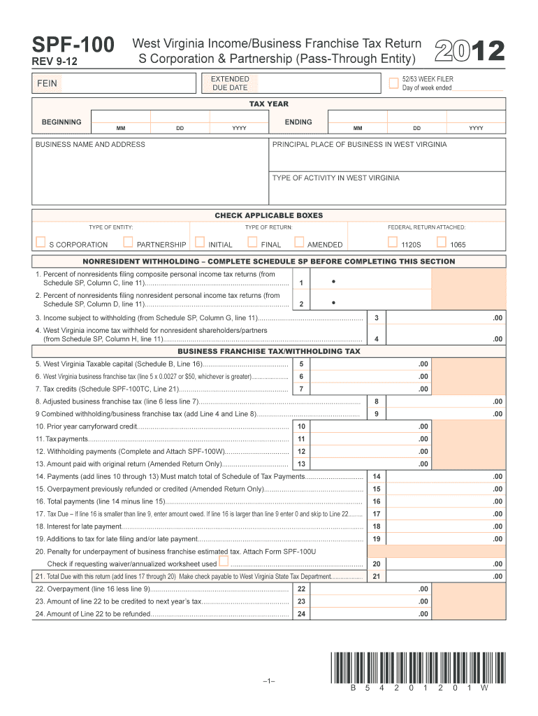 SPF-100 West Virginia Income×Business Franchise Tax Return S Corporation & Partnership (Pass-Through Entity) REV 9-12 52×53 WEEK FILER Day of week ended EXTENDED DUE DATE VEIN 2012 TAX YEAR BEGINNING