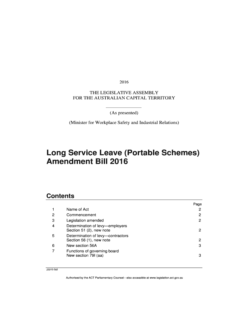 2016 THE LEGISLATIVE ASSEMBLY FOR THE AUSTRALIAN CAPITAL TERRITORY (As presented) (Minister for Workplace Safety and Industrial Relations) Long Service Leave (Portable Schemes) Amendment Bill 2016