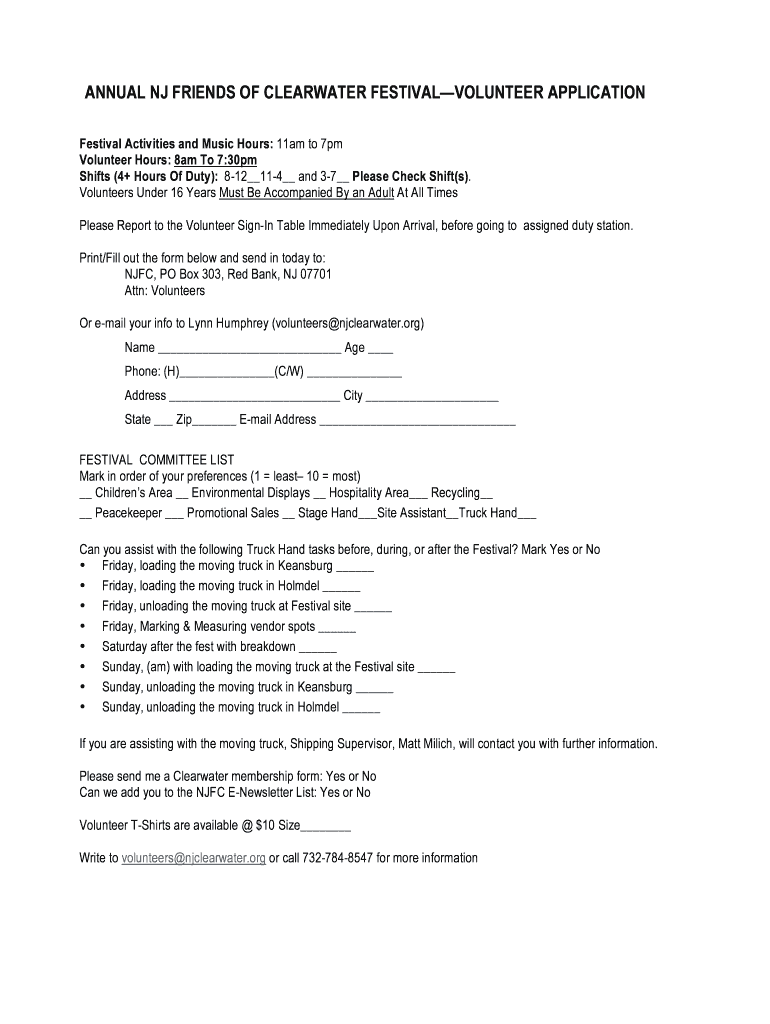 Get the free ANNUAL NJ FRIENDS OF CLEARWATER FESTIVALVOLUNTEER APPLICATION - mcclearwater