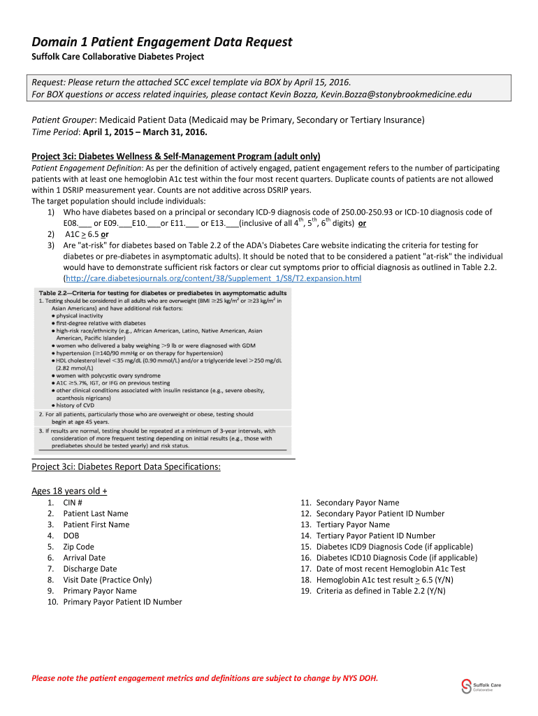 Domain 1 Patient Engagement Data Request Suffolk Care Collaborative Diabetes Project Request: Please return the attached SCC excel template via BOX by April 15, 2016. For BOX questions or access related