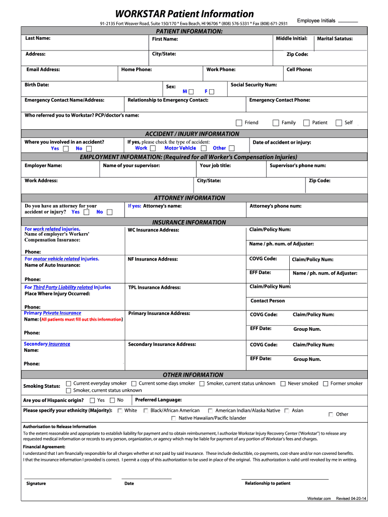 WORK STAR Patient Information Employee Initials 912135 Fort Weaver Road, Suite 150×170 * Era Beach, HI 96706 * (808× 5765331 * Fax (808× 6712931 PATIENT INFORMATION: Last Name: First Name: Address: