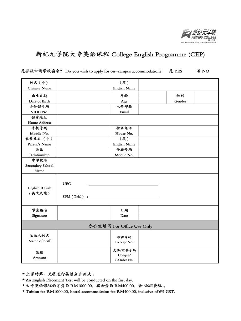 College English Program (CEP) on Do you wish to apply for on campus accommodation? Chinese Name English Name Date of Birth ERIC No. Home Address Age Email Mobile No. Parents Parent s Name Relationship