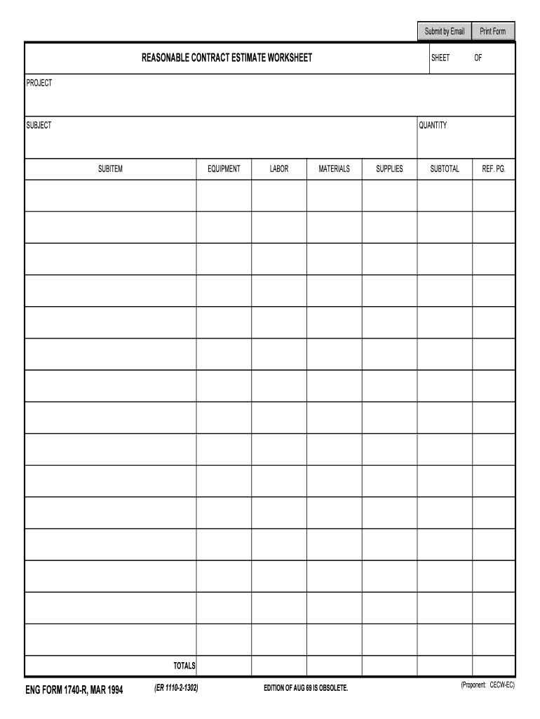 Submit by Email REASONABLE CONTRACT ESTIMATE WORKSHEET SHEET Print Form OF PROJECT SUBJECT QUANTITY SUITE EQUIPMENT LABOR MATERIALS SUPPLIES SUBTOTAL REF. PG. TOTALS ENG FORM 1740R, MAR 1994 (ER 111021302)