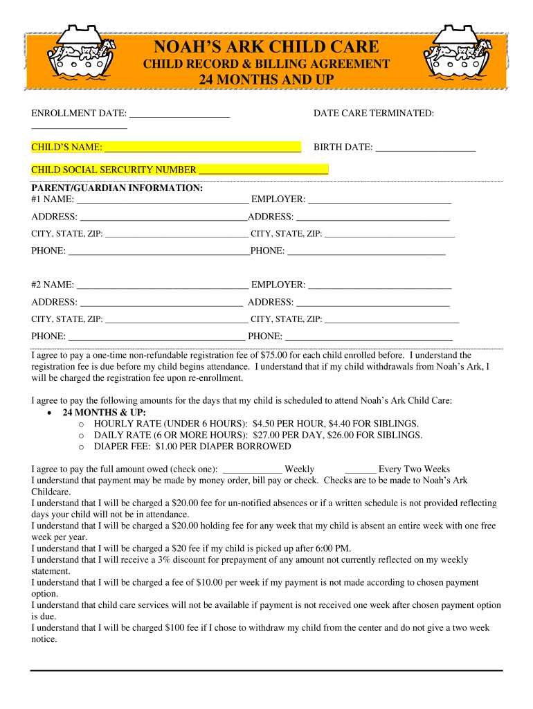 NOAH ARK CHILD CARE CHILD RECORD & BILLING AGREEMENT 24 MONTHS AND UP ENROLLMENT DATE: DATE CARE TERMINATED: CHILD NAME: BIRTH DATE: CHILD SOCIAL SECURITY NUMBER PARENT×GUARDIAN INFORMATION: #1 NAME: