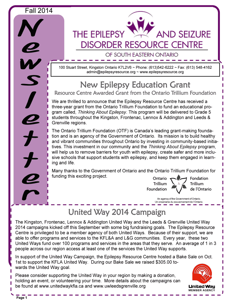 Fall 2014 100 Stuart Street, Kingston Ontario K7L2V6 Phone: (613×5426222 Fax: (613× 5484162 admin epilepsy resource.org www.epilepsyresource.org New Epilepsy Education Grant Resource Center Awarded