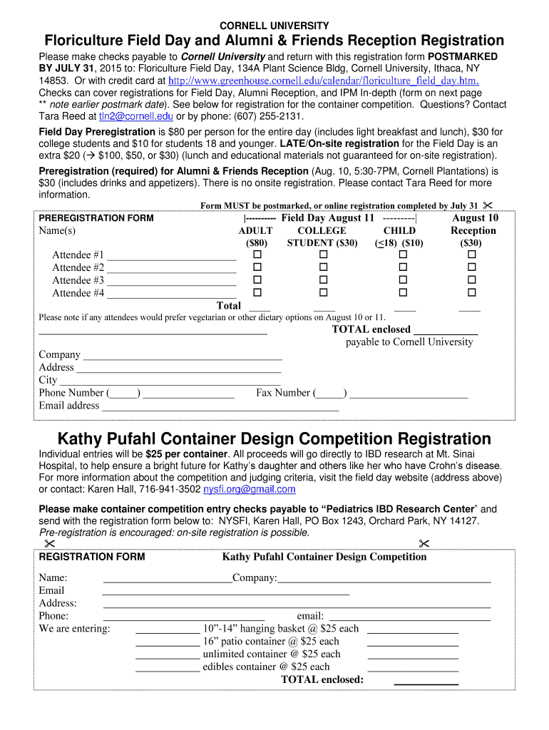 CORNELL UNIVERSITY Agriculture Field Day and Alumni & Friends Reception Registration Please make checks payable to Cornell University and return with this registration form POSTMARKED BY JULY 31,