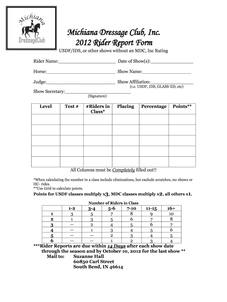 Michigan Dressage Club, Inc. 2012 Rider Report Form USAF×IDS, or other shows without an MDC, Inc Rating Rider Name: Date of Show’s): Horse: Show Name: Judge: Show Affiliation: (i.e. USAF, IDS,