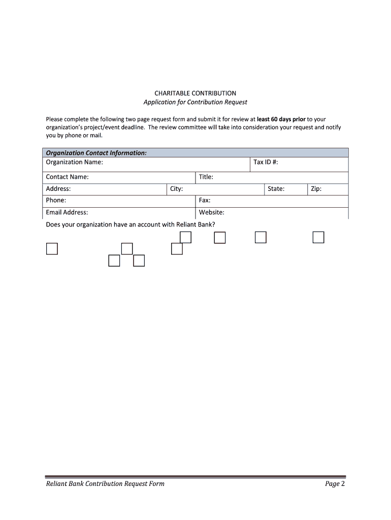 GIVINGBACKPROGRAM Eligibility ReliantBankiscommittedtothecommunitiesweserve. Duetothevolumeofrequests, behave developedthefollowingcriteriaforeligibilityforourGivingBackProgram: Requestsmustbesubmitted60daysinadvance