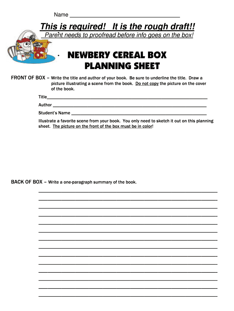 Name This is required! It is the rough draft!! Parent needs to proofread before info goes on the box! NEWBERRY CEREAL BOX PLANNING SHEET FRONT OF BOX Write the title and author of your book. Be sure