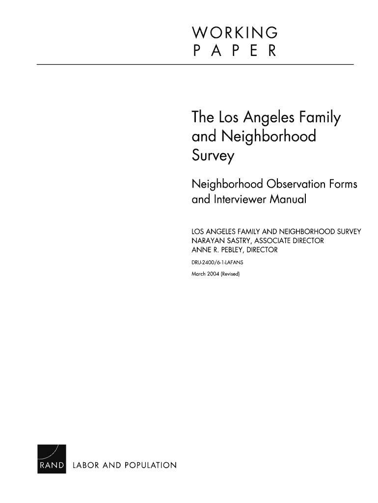 WORKING P A P E R The Los Angeles Family and Neighborhood Survey Neighborhood Observation Forms and Interviewer Manual LOS ANGELES FAMILY AND NEIGHBORHOOD SURVEY NARAYANA PASTRY, ASSOCIATE DIRECTOR