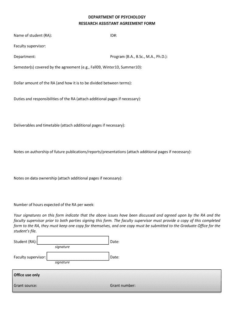 DEPARTMENT OF PSYCHOLOGY RESEARCH ASSISTANT AGREEMENT FORM Name of student (RA): ID#: Faculty supervisor: Department: Program (B.A., B.Sc., M.A., Ph.D.): Semester’s) covered by the agreement (e.g.,