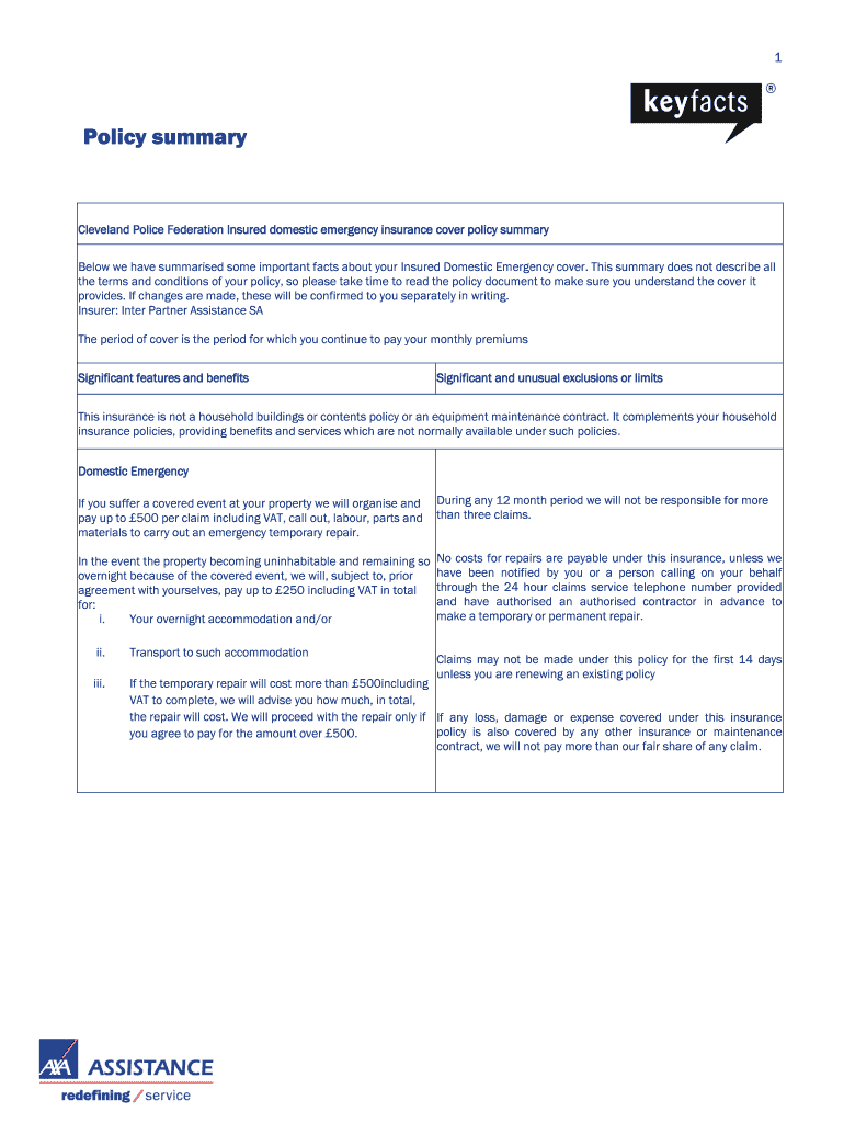1 Policy summary Cleveland Police Federation Insured domestic emergency insurance cover policy summary Below we have summarized some important facts about your Insured Domestic Emergency cover. This