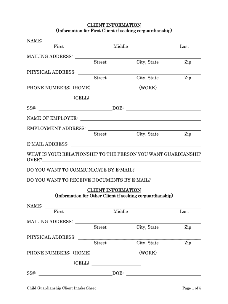 Child Guardianship Client Intake Sheet Page 1 of 5 CLIENT INFORMATION (Information for First Client if seeking coguardianship) NAME: First Middle Last