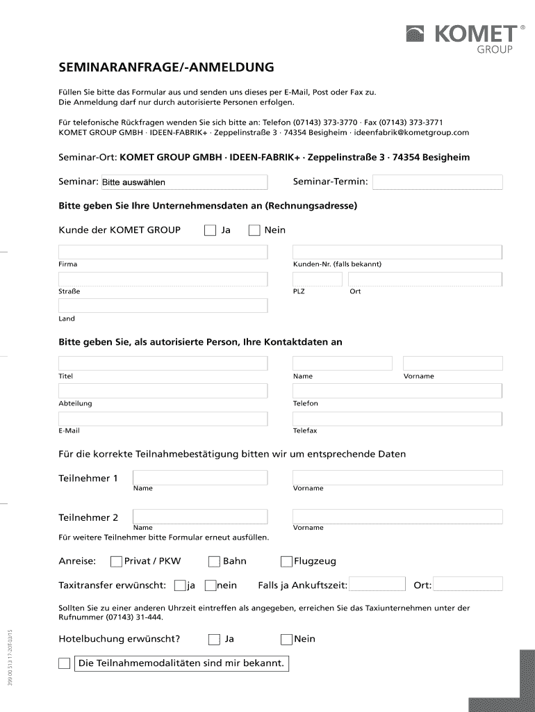 pdf-anmeldeformular - komet group ist ein Formular, das verwendet wird, um sich für Veranstaltungen oder Schulungen der Komet Group anzumelden.